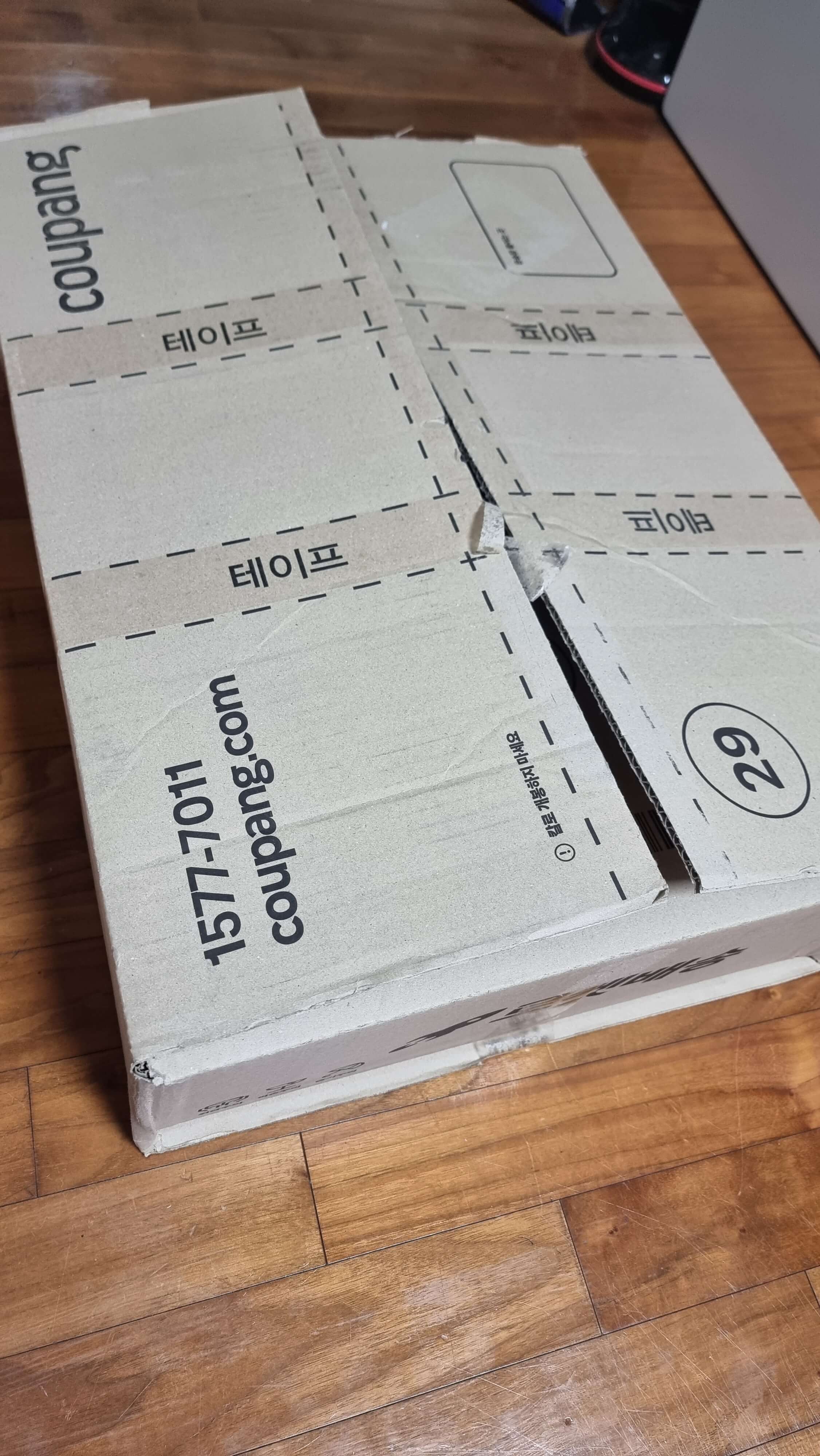 제품이 온 것을 보면 박스크기가 일단 어마어마 합니다. 40kg 정도 쌀가마가 들어갈만한 박스에 제품이 왔는데요. 박스 크기가 크기 때문에 박스테이프도 꽁꽁 묶어서 왔습니다.