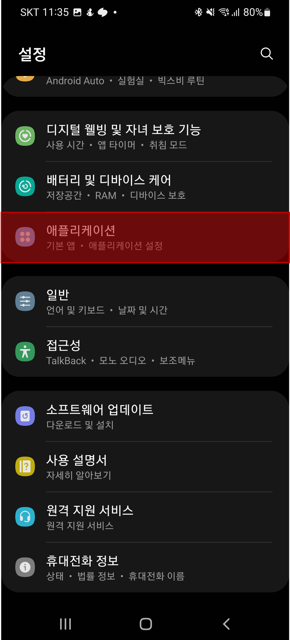 화면을 아래로 내리다보면 애플리케이션 설정이 나옵니다. 이것을 선택해주세요.