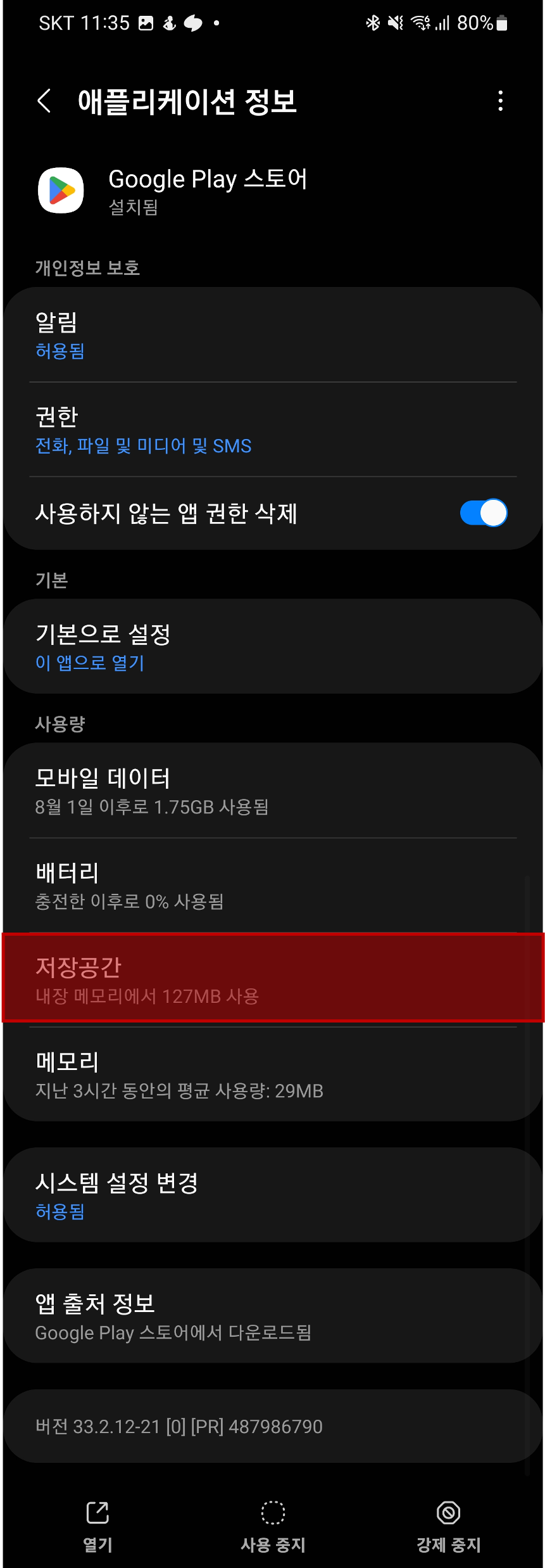 애플리케이션 정보에서 저장공간을 선택합니다.