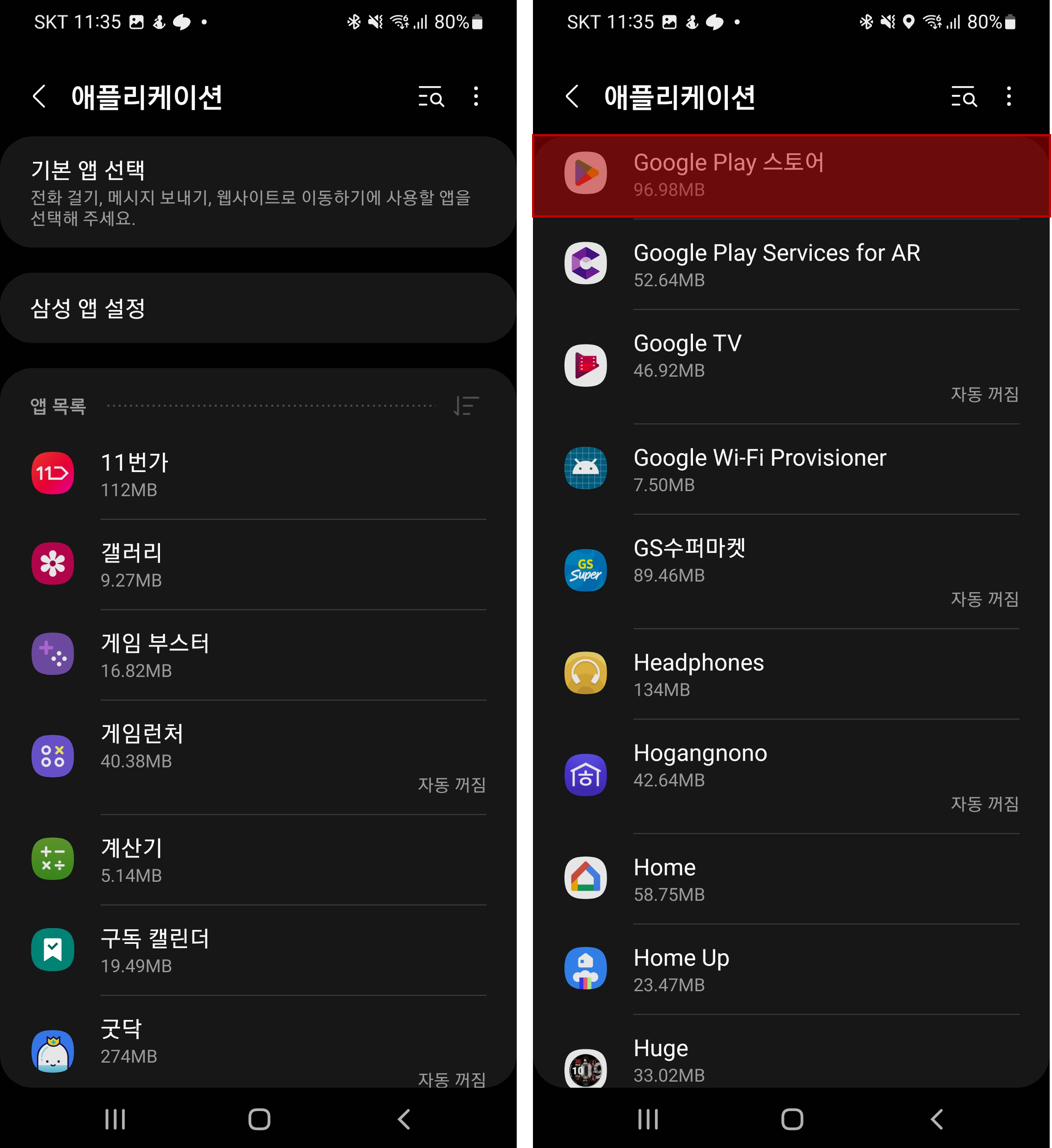 애플리케이션에서 어플리케이션을 쭉~ 내려서 Google Play 스토어를 선택합니다.