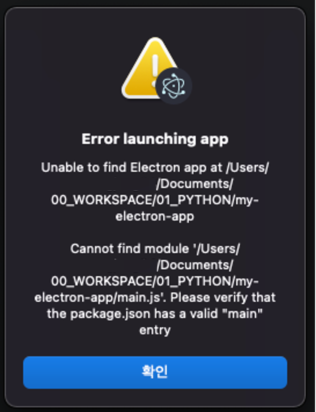하지만... 짜잔!! 하고 오류가 발생하네요. Electron.js를 실행했을 때 main.js 파일의 내용을 읽게 되는데 main.js 파일이 없기 때문이에요. 그렇다면 간단하게 내용을 만들어 볼께요.