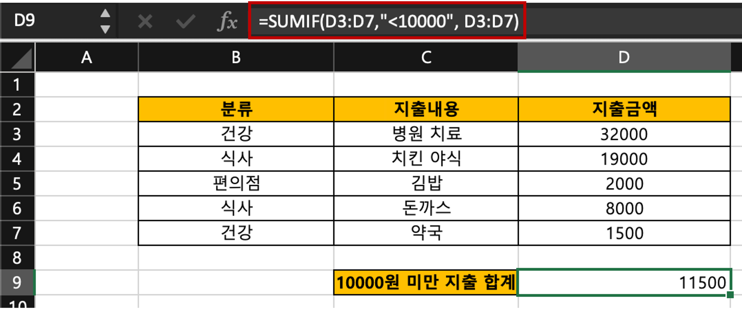 데이터에서 지출금액에 10,000원 미만인 것은 김밤, 돈까스, 약국으로 지출된 금액인데, 합산을 하면 11,500원이라는 결과가 나옵니다.