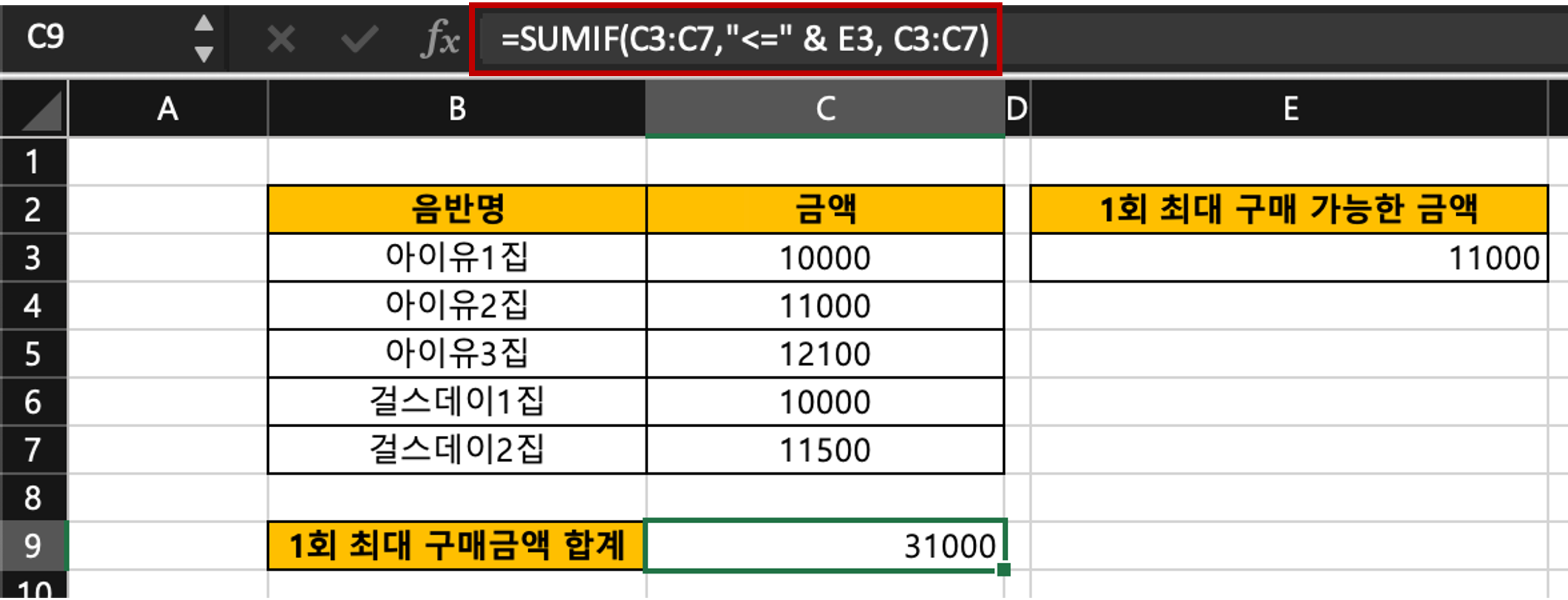 함수 조건에서 &의 기호는 "<="와 1회 최대 구매 가능한 금액을 연결해주는 역할을 합니다.