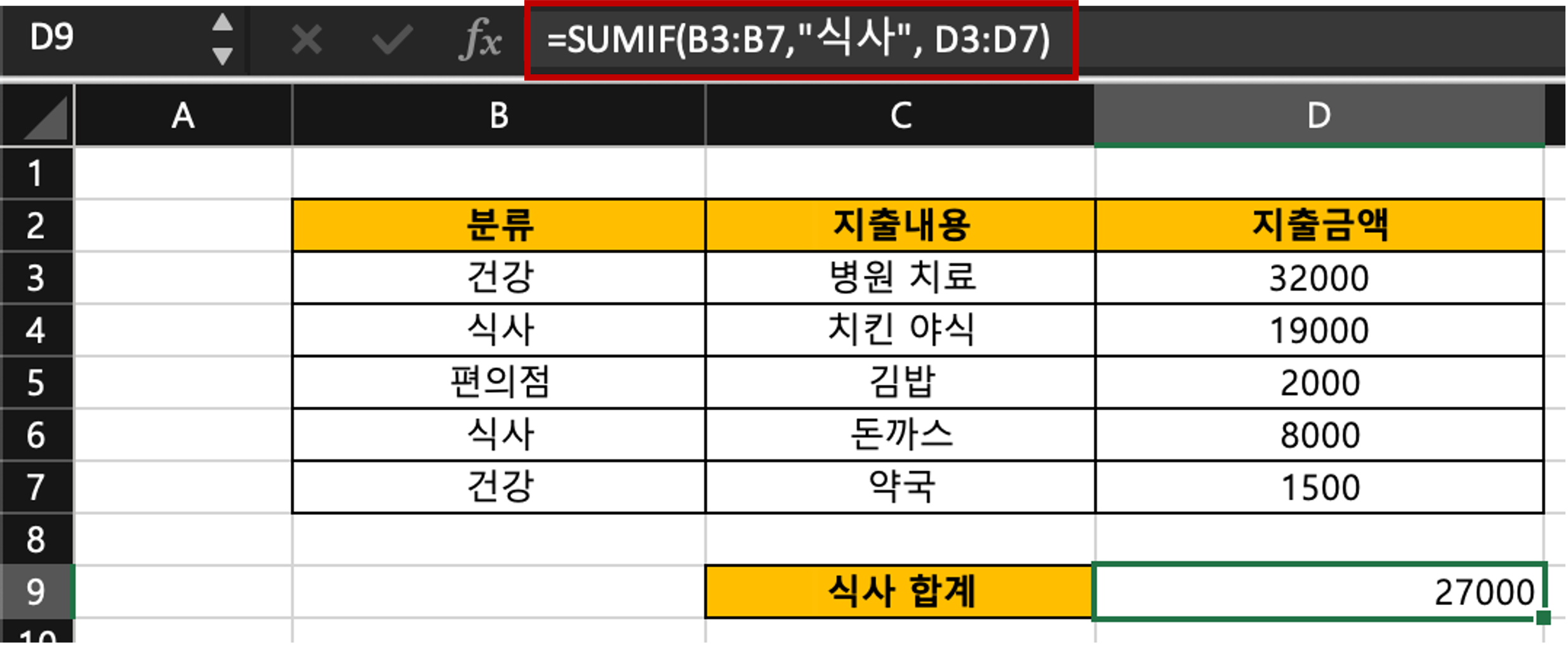 합산할 셀을 선택하고 =SUMIF(B3:B7, "식사", D3:D7)이라고 입력한 후, 키보드의 Enter키를 누릅니다.