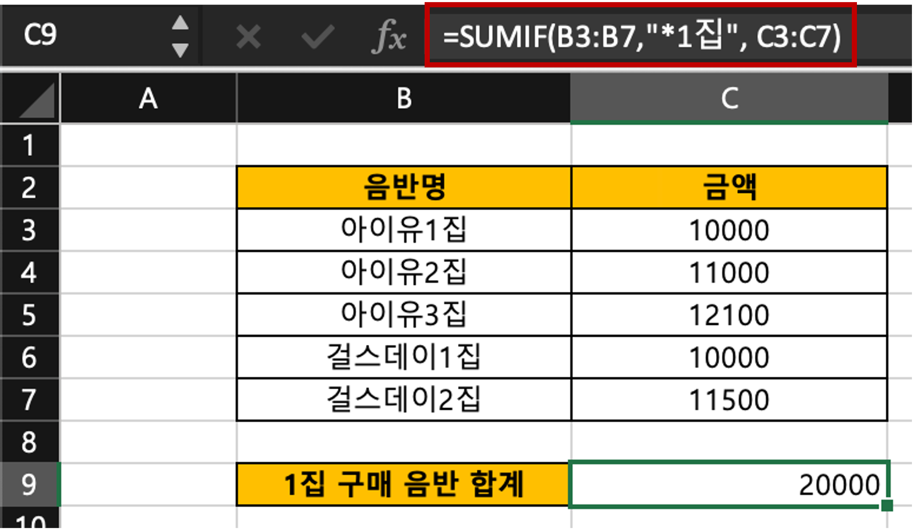 음반명과 금액의 목록을 나타내는 데이터가 있습니다. 이 음반에는 아이유와 걸스데이 음반명이 있는데 아이유 음반에 대한 합계를 구하고자 할 때 함수의 조건에서 "아이유*"과 같이 입력을 하게 되면 * 라는 기호는 아이유로 시작하는 모든 문자를 검색하라는 의미입니다.