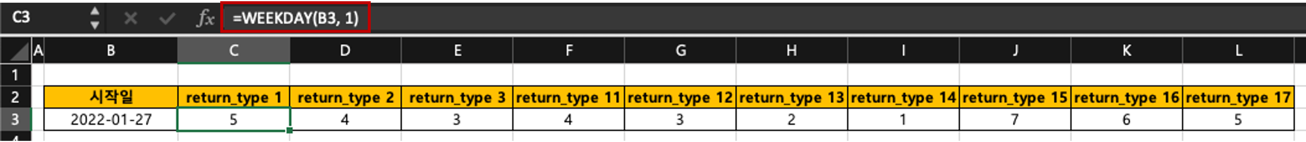 | return_type | 반환 값 유형을 결정하는 숫자입니다. 생략 가능합니다. - 1 또는 생략 : 1(일요일)에서 7(토요일) 사이의 숫자 - 2 : 1(월요일)에서 7(일요일) 사이의 숫자 - 3 : 0(월요일)에서 6(일요일) 사이의 숫자 - 11 : 1(월요일)에서 7(일요일) 사이의 숫자 - 12 : 1(화요일)에서 7(월요일) 사이의 숫자 - 13 : 1(수요일)에서 7(화요일) 사이의 숫자 - 14 : 1(목요일)에서 7(수요일) 사이의 숫자 - 15 : 1(금요일)에서 7(목요일) 사이의 숫자 - 16 : 1(토요일)에서 7(금요일) 사이의 숫자 - 17 : 1(일요일)에서 7(토요일) 사이의 숫자 |