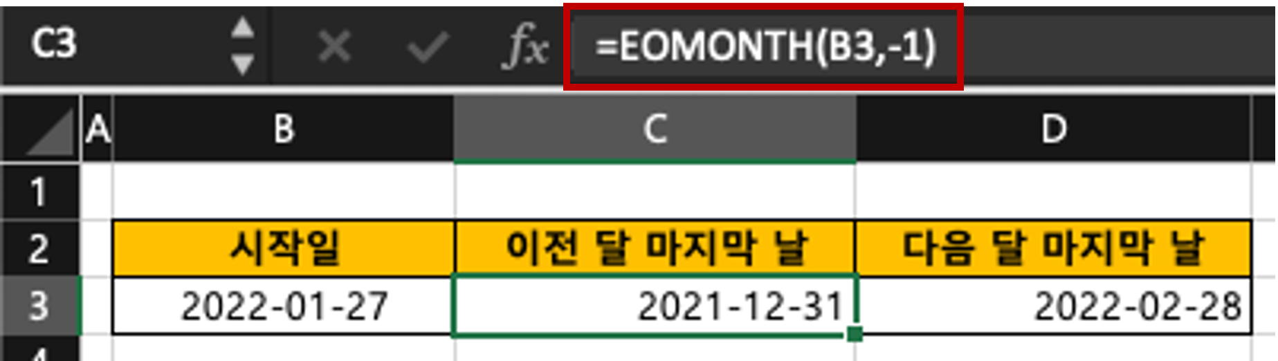 날짜를 입력한후, 이전 달 마지막 날을 구할 셀에 =EOMONTH(B3, -1) 이라고 같이 입력한 후, 키보드의 Enter키를 누릅니다.