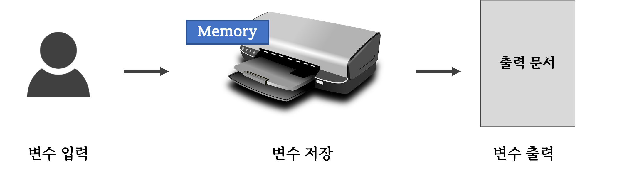 위의 과정을 변수로 저장하고 출력하는 과정으로 생각해볼께요. 사용자가 변수를 입력을 합니다. 그러면 PC(컴퓨터)의 메모리에 입력한 변수가 저장이 되고, 그 변수를 출력하면 저장된 변수를 확인하실 수 있습니다.