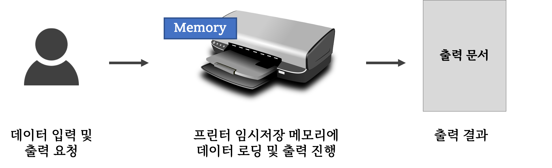 일반적으로 사용하는 프린터의 예를 들어볼께요. 사용자가 데이터를 입력 및 출력을 요청하면 프린터의 임시저장 메모리에 데이터를 로딩하고 출력을 진행하여 출력 결과가 표시가 됩니다.