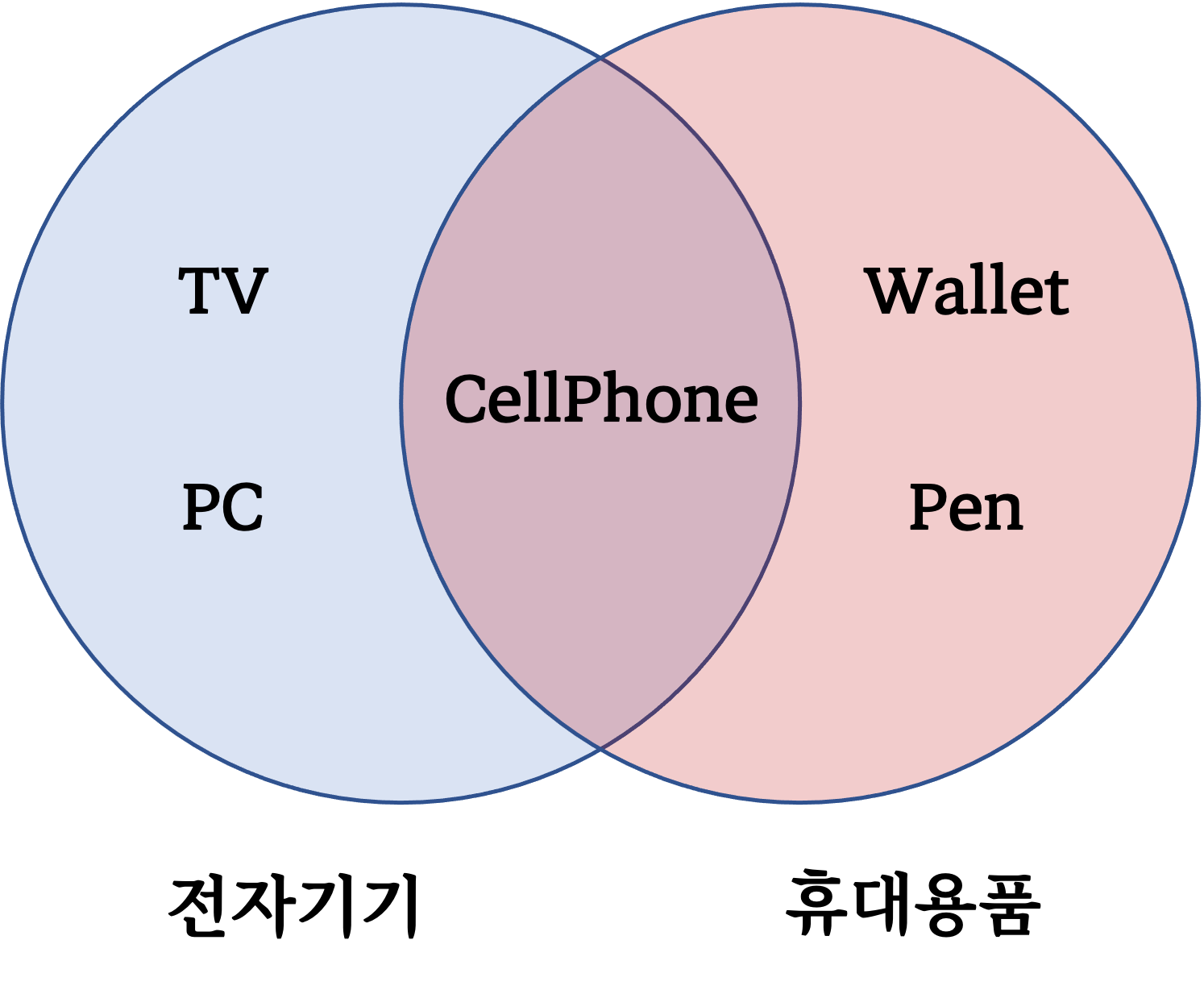 전자기기 원소에는 전자기기인 TV, PC, CellPhone이라는 데이터가 있고, 휴대용품 원소에는 Wallet, CellPhone, Pen의 데이터가 있습니다.
