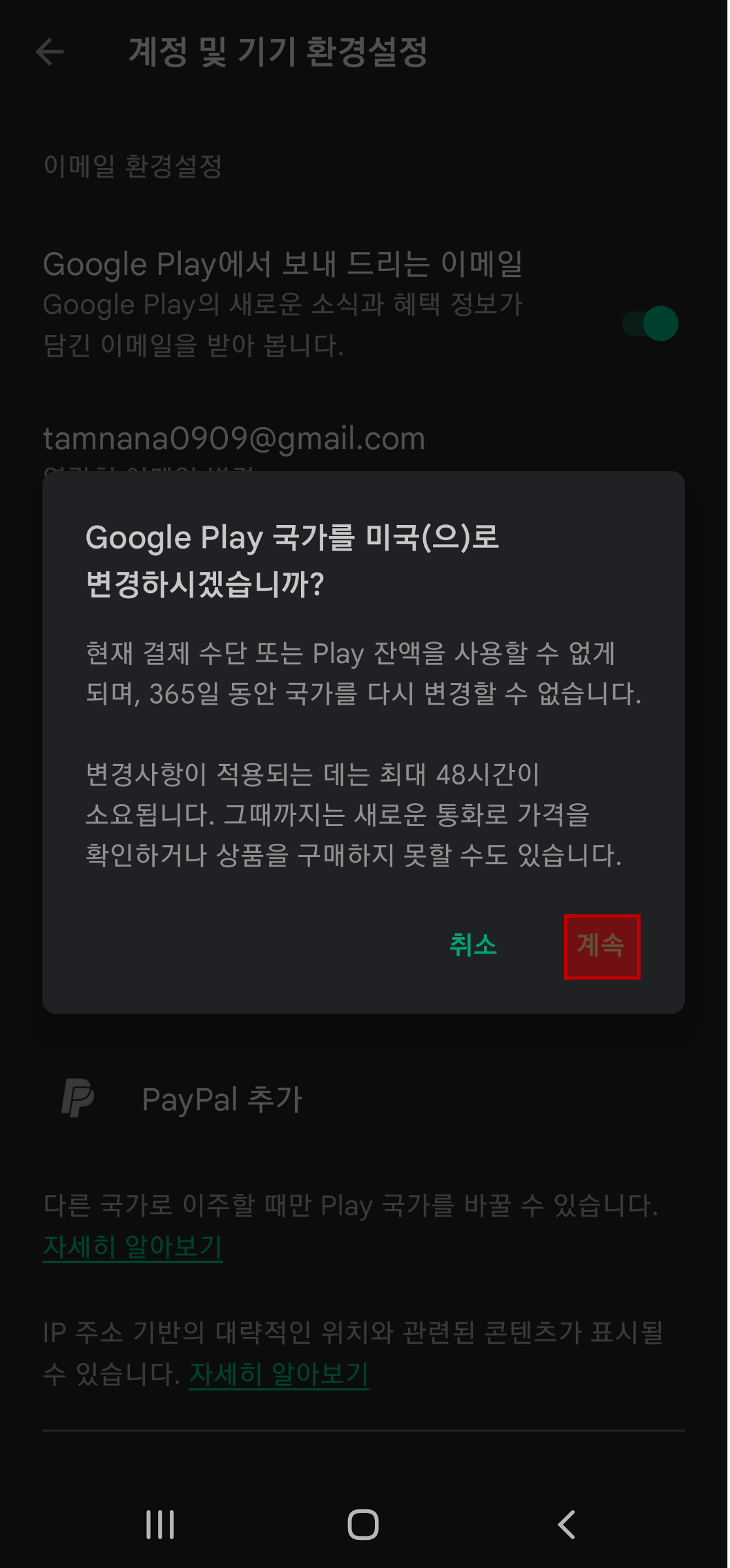 최종적으로 미국 계정으로 변경할지 물어보는데 계속을 선택해주세요.