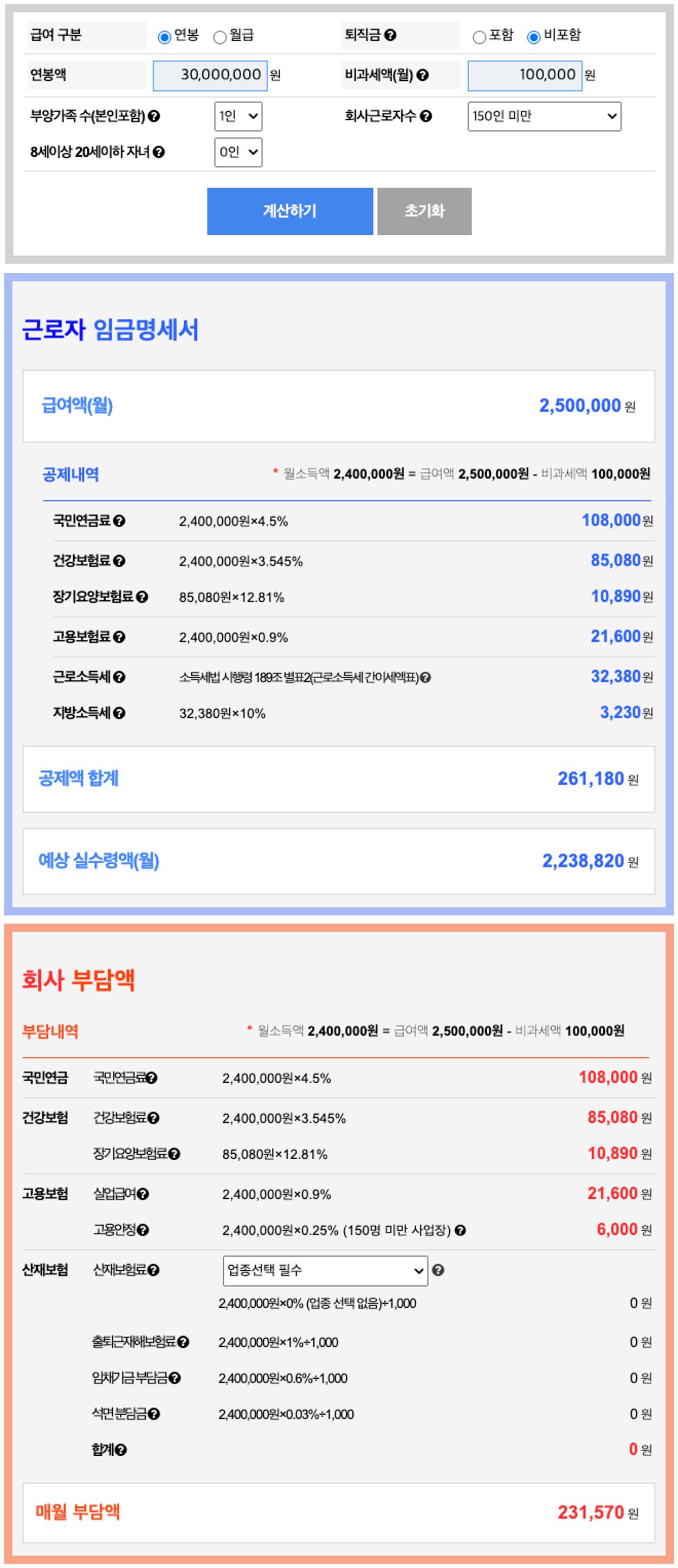 - 연봉 3000만원 : 2,238,820원, 공제액 : 261,180원