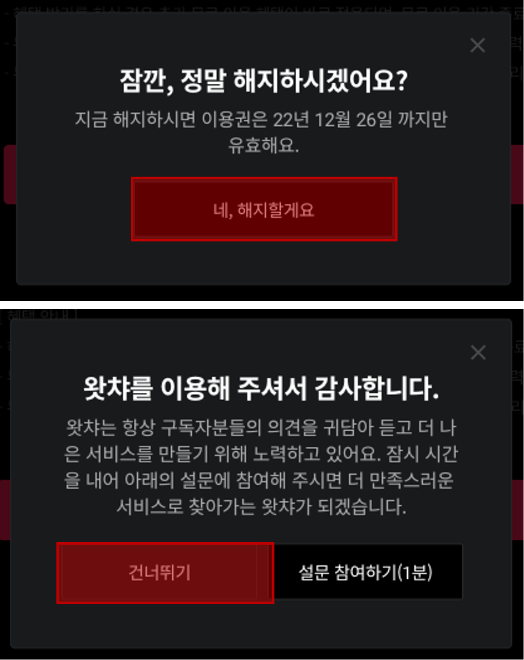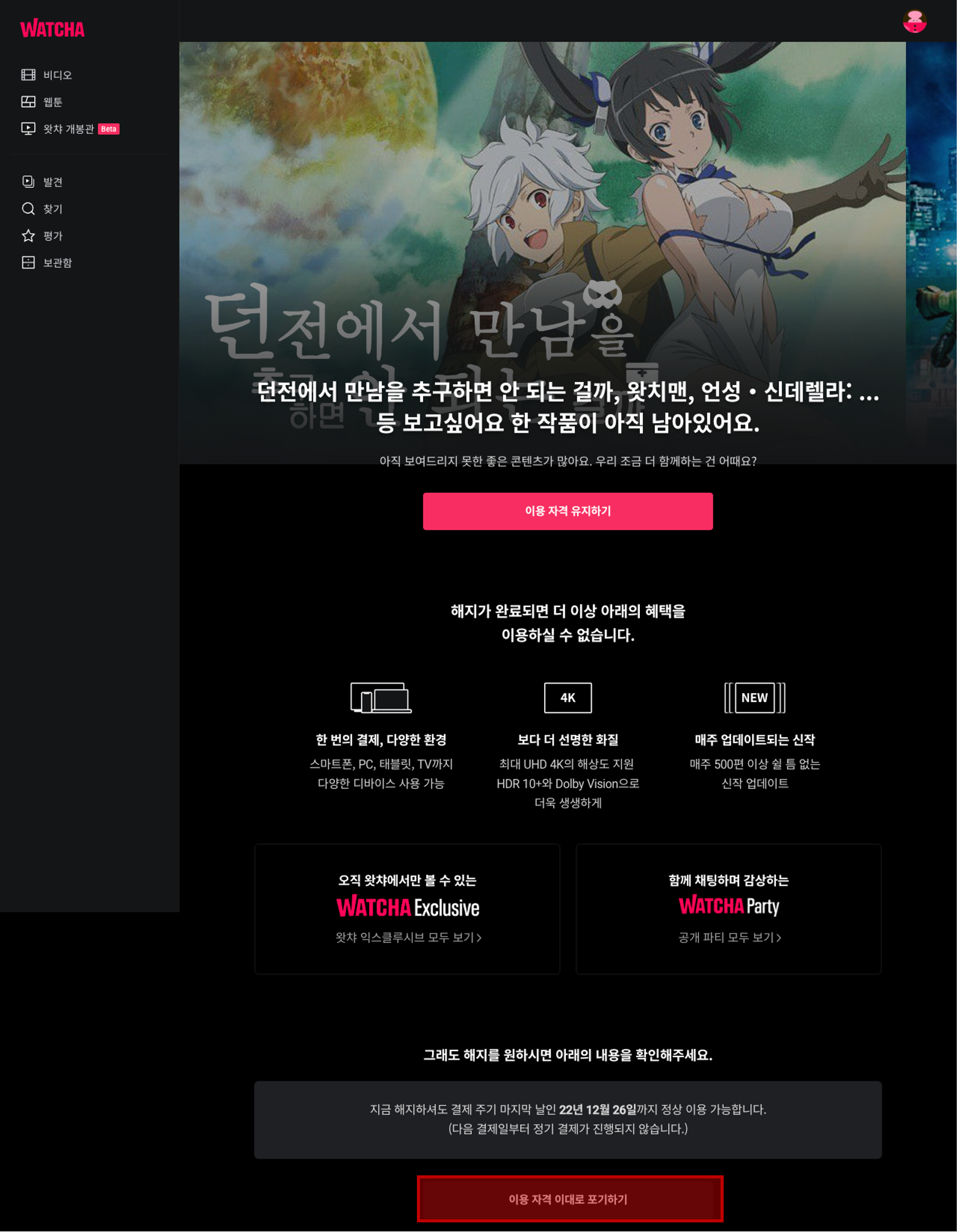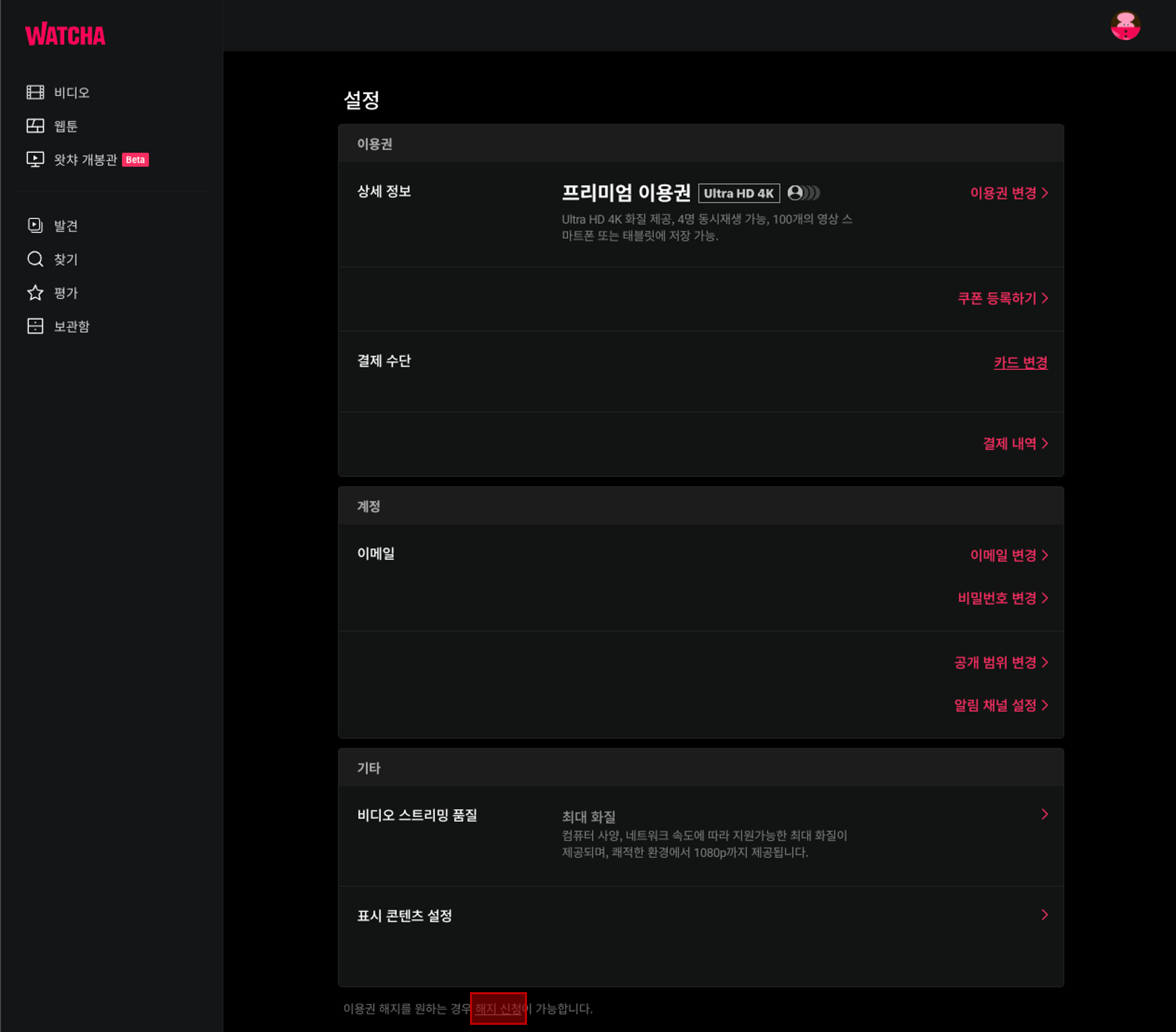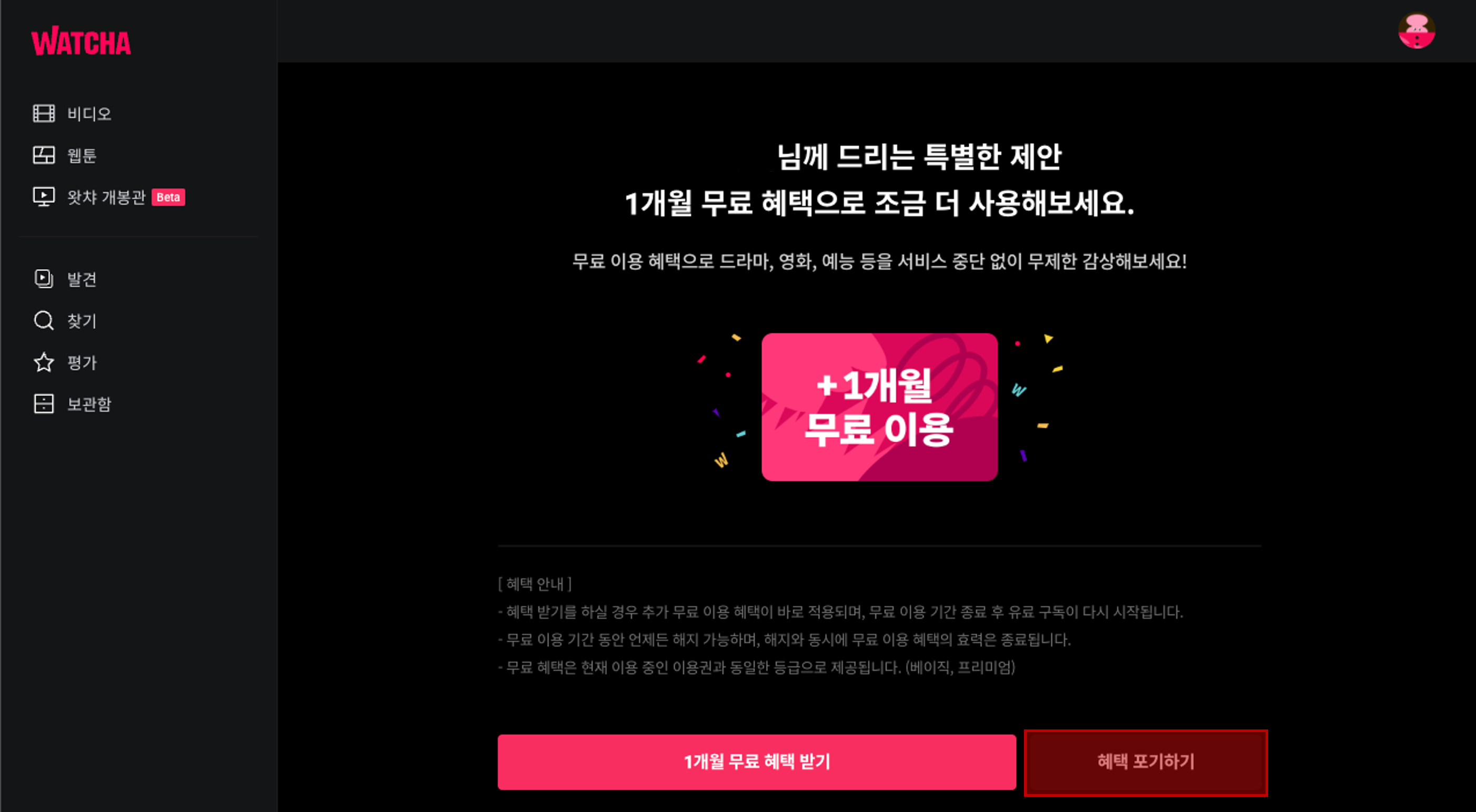 왓챠는 해지 프로세스가 복잡하기도 하고 회유책을 많이 쓰는데 1개월을 무료로 더 준다거나 해서 사용자가 계속 이용할 수 있도록 회유하는 모습을 보고 대단하다고 느꼈습니다. 저도 그냥 1개월을 무료로 더 써볼까도 생각해보았지만 다른 계획이 있어 해지를 진행하였습니다.