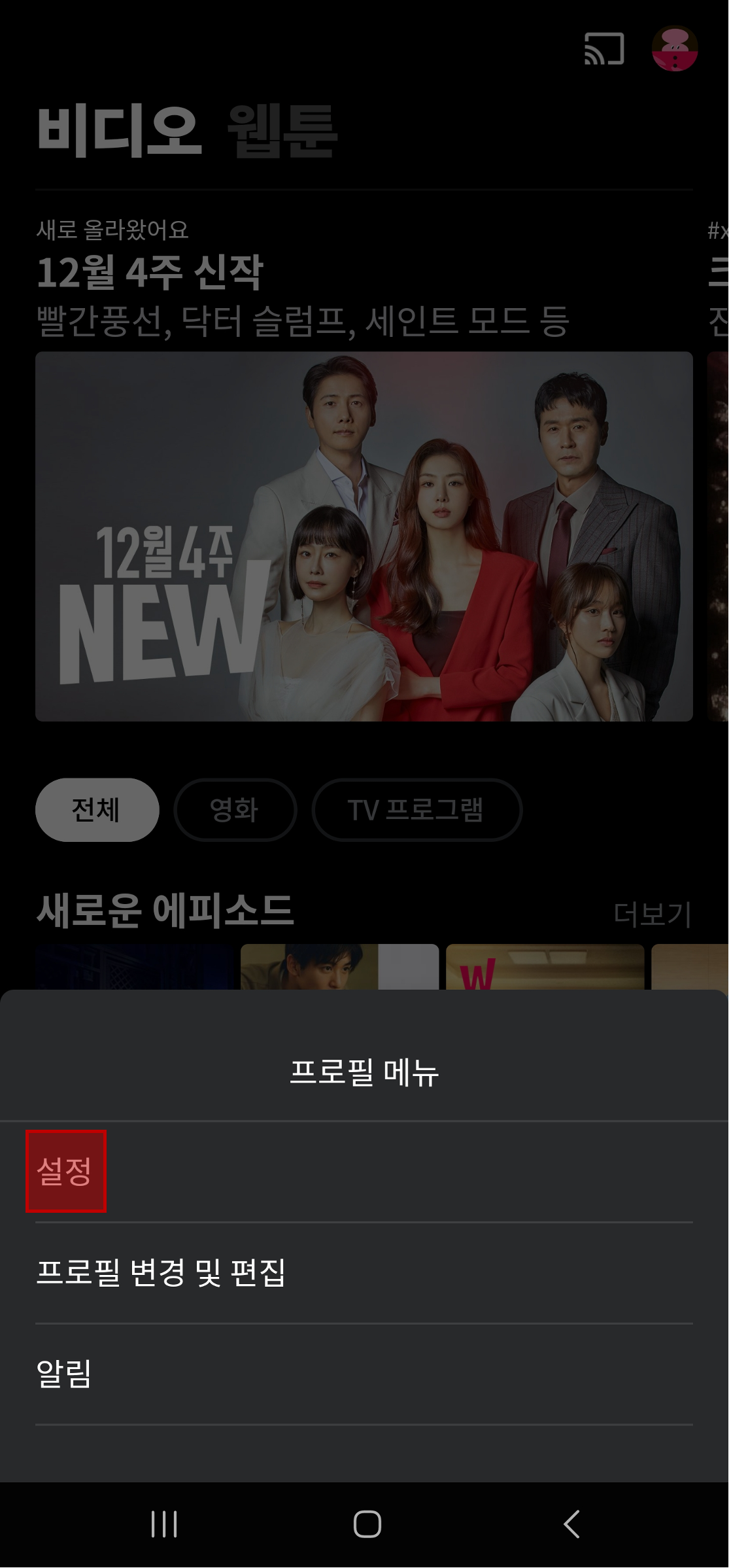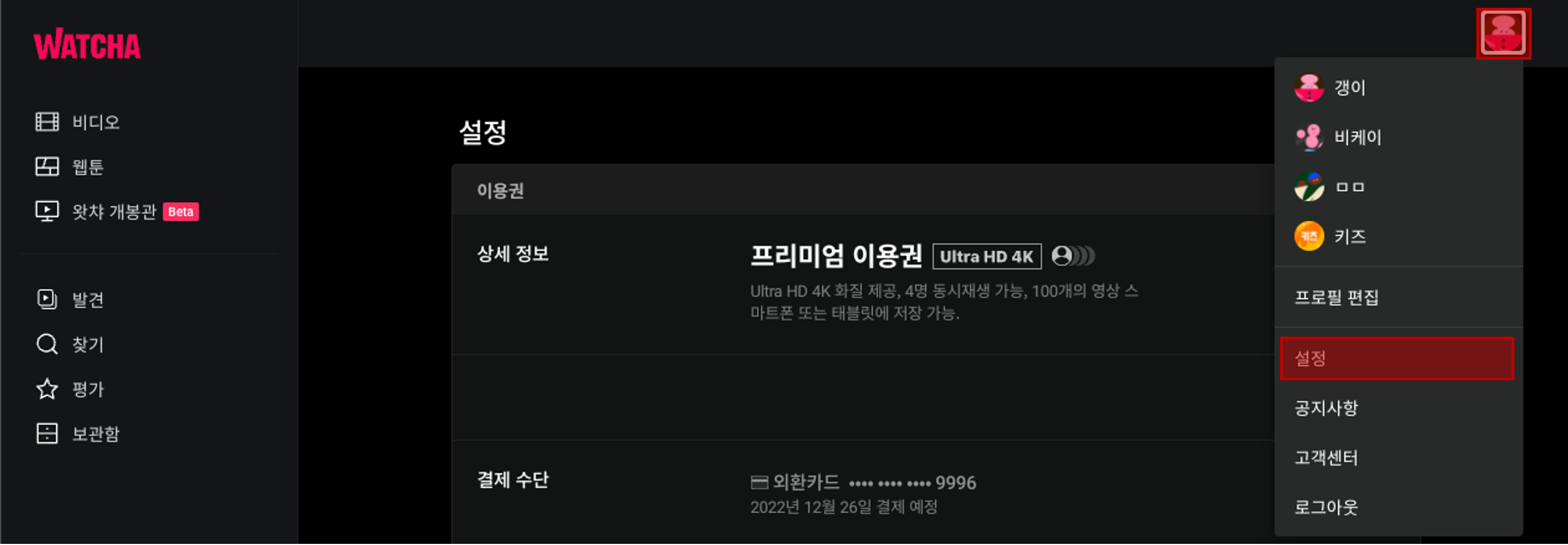 PC 웹브라우저에서 왓챠가 로그인 된 상태에서 우측 상단의 프로필 아이콘을 선택해주시고 설정을 선택해주세요.