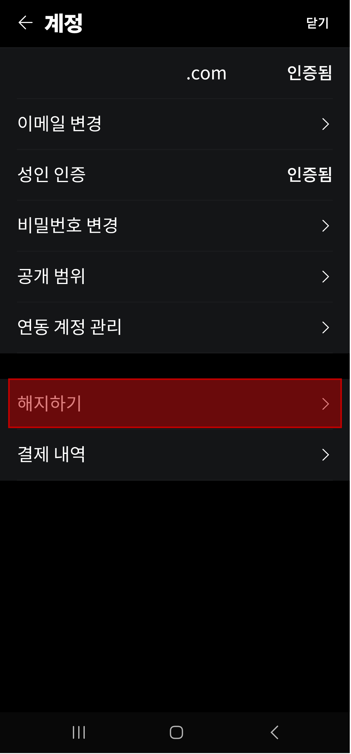 설정화면에서 하단에 작은 글씨로 되어있는 해지 신청을 선택해주세요.
