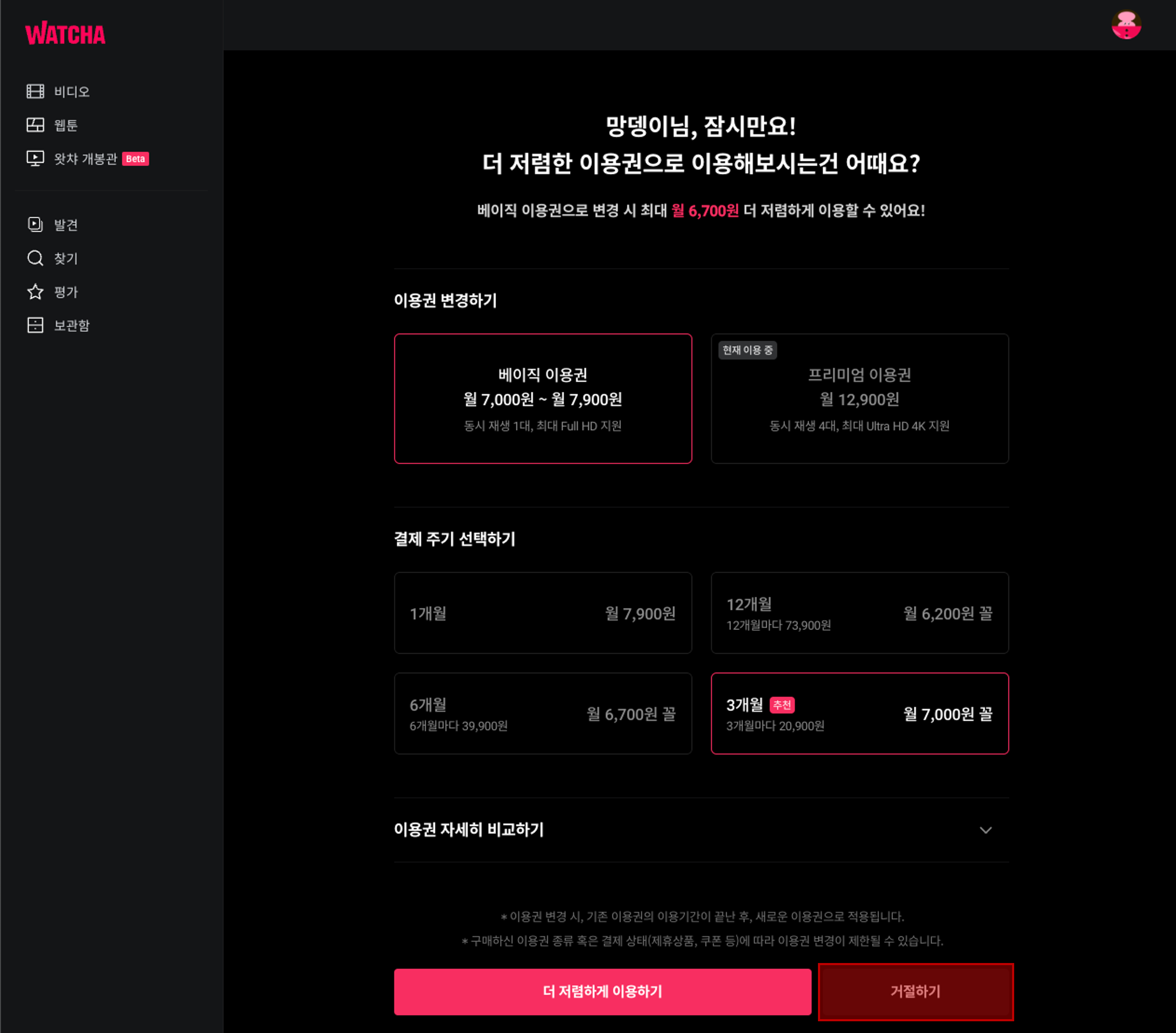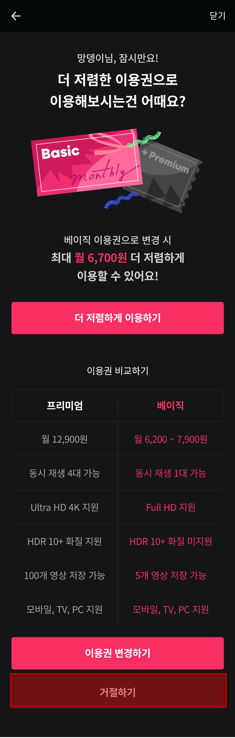 이용권을 변경하라는 권유가 나오는데 무시하시고 하단의 거절하기를 선택해주세요.