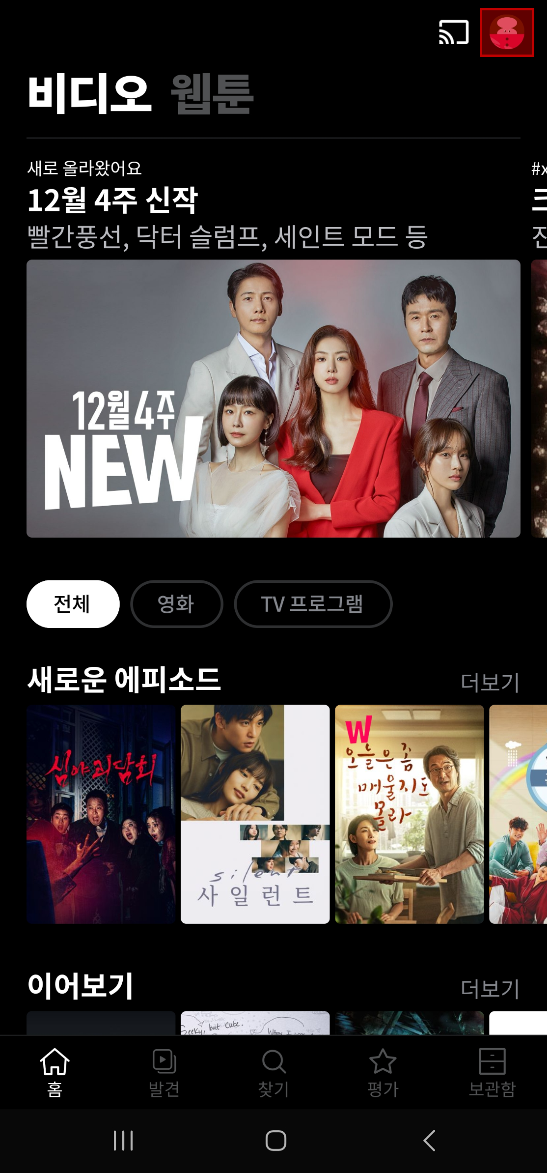 먼저 앱에서 우측 상단의 프로필 아이콘을 선택해주세요.