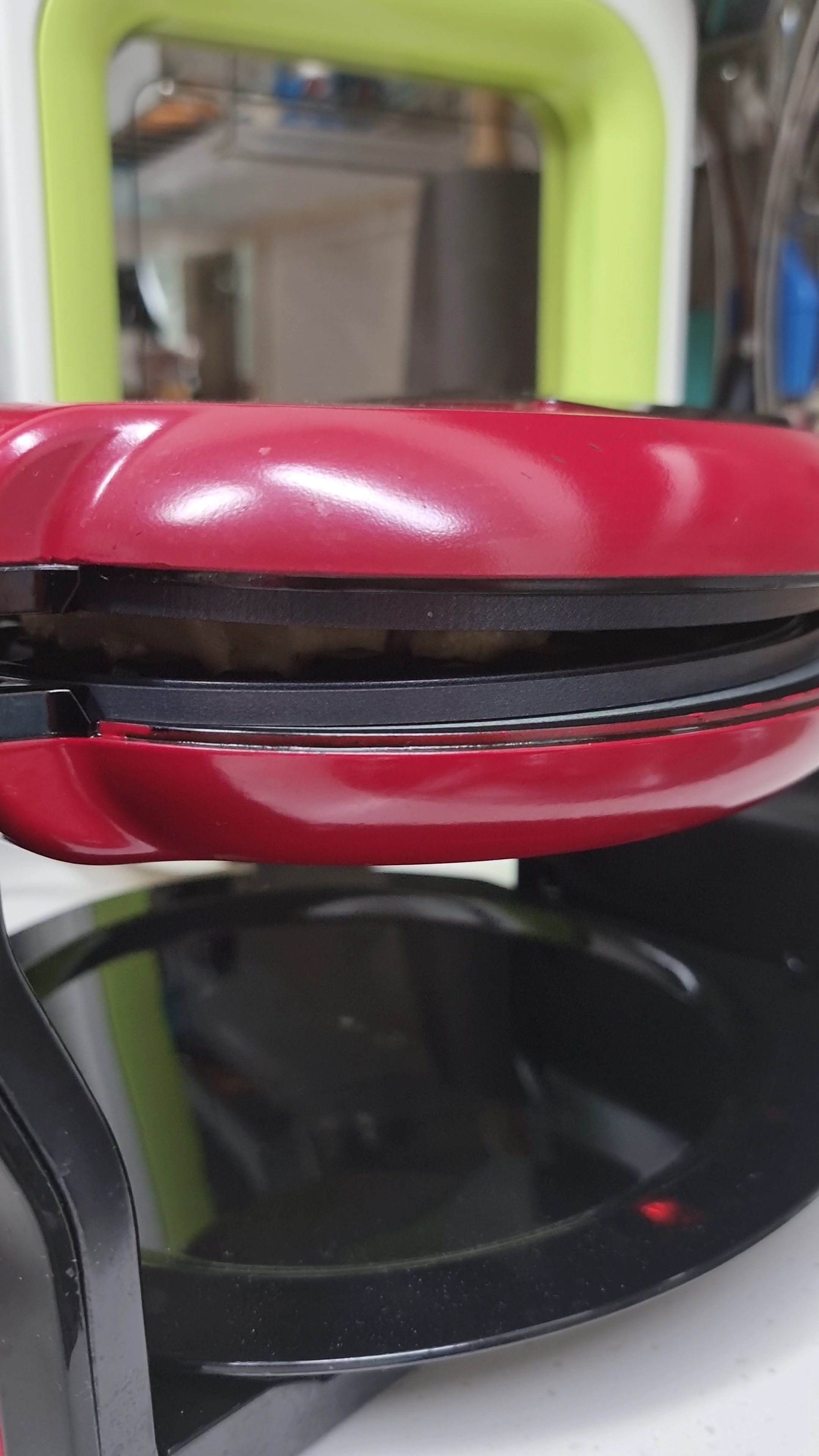 손잡이를 위로 들어올렸을 때 와플팬이 장착시 모습입니다. 빨간색으로 표시된 부분을 살짝 당겨주면 와플팬이 분리가 되는 구조입니다.