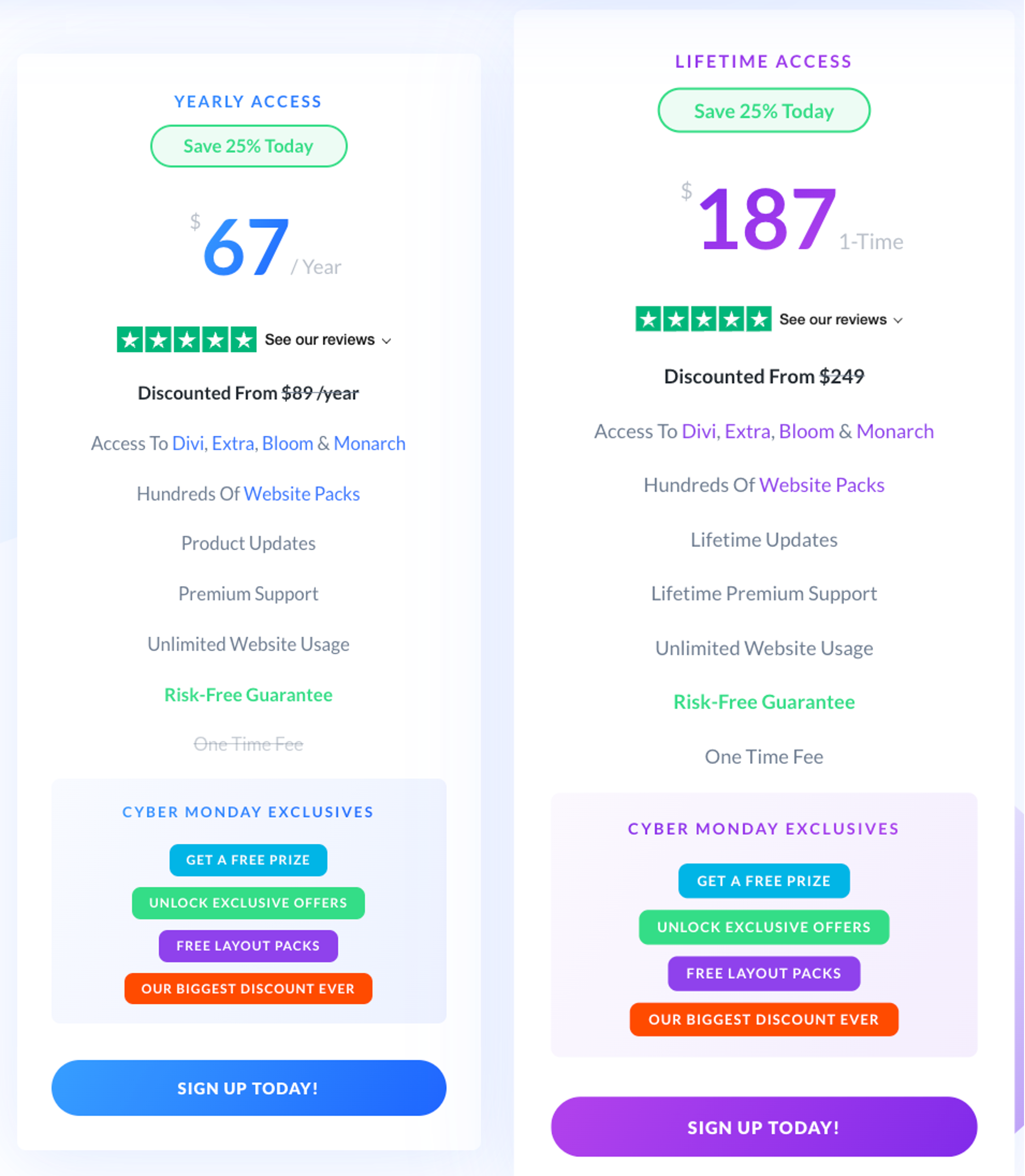 Divi 테마의 요금제는 1년에 67달러씩 결제(25% 할인), 1번 결제 하여 평생사용할 수 있는 187달러(25% 할인, 평소에는 249달러) 짜리 요금제가 있습니다.