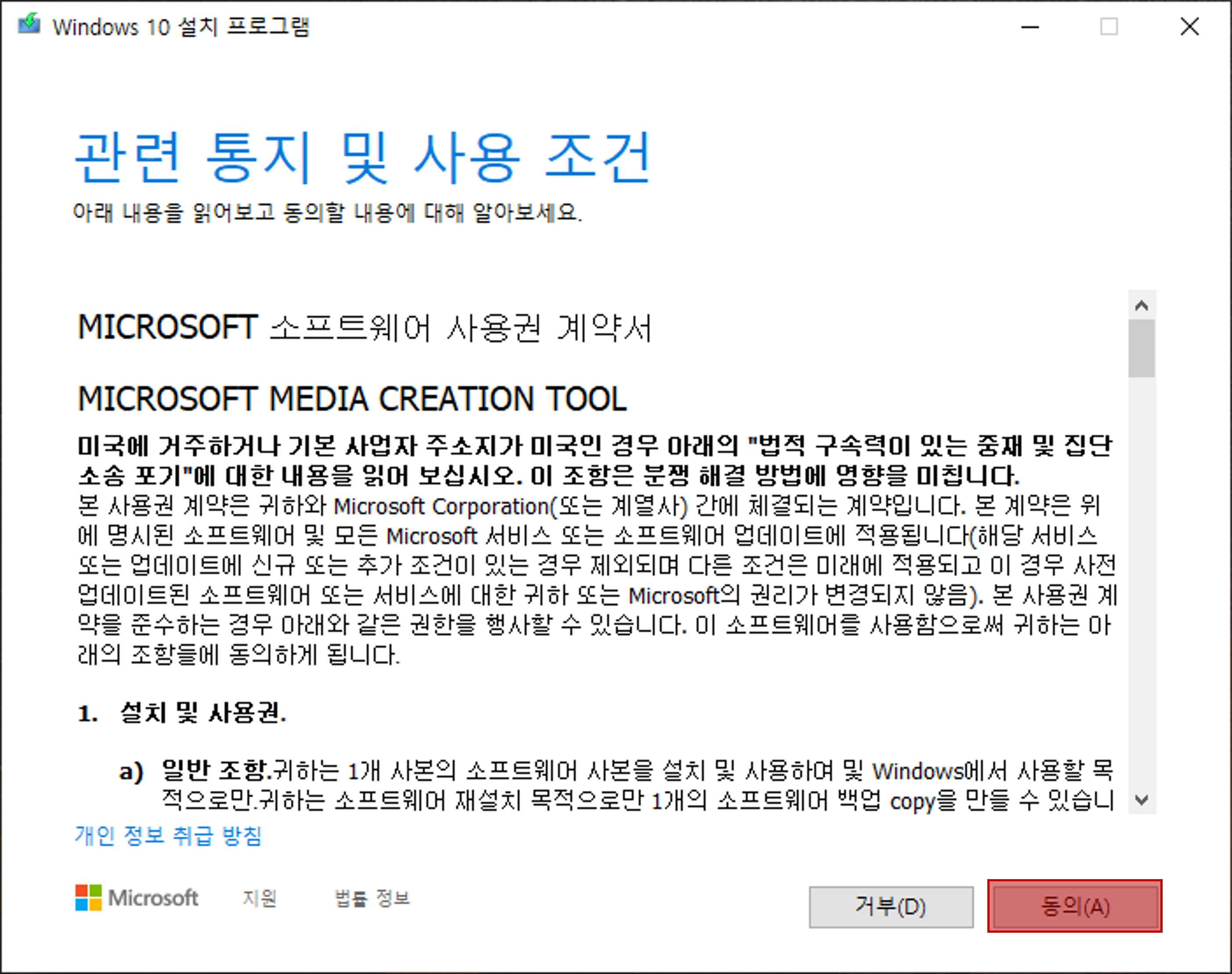 다운로드 받은 파일을 실행하면 아래와 같이 소프트웨어 사용권 계약서가 나오는데 동의를 선택합니다. 동의하지 않으면 더이상 진행되지 않습니다.