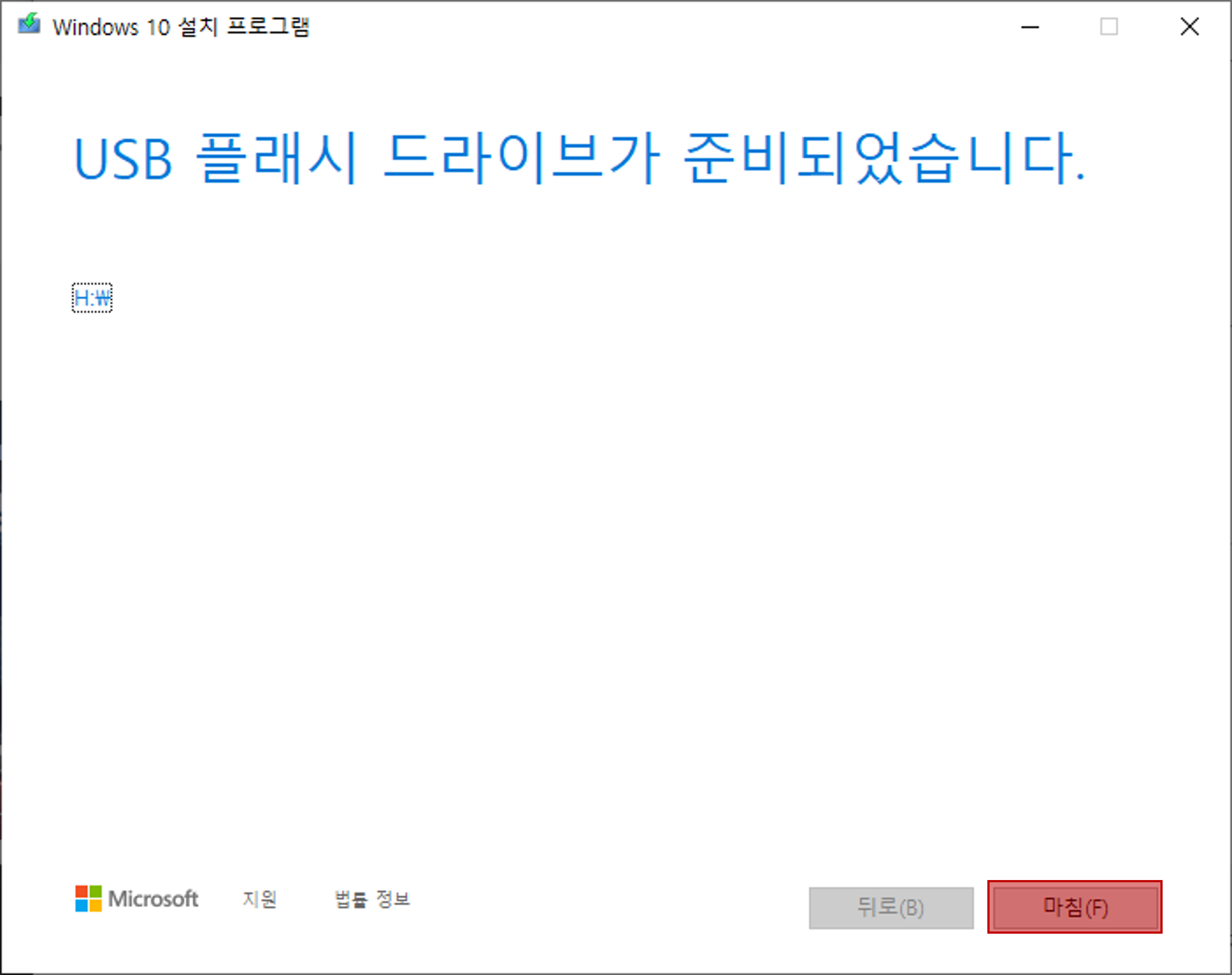 USB에 윈도우 설치디스크가 만들어졌습니다. 마침을 눌러서 마무리 해주세요.