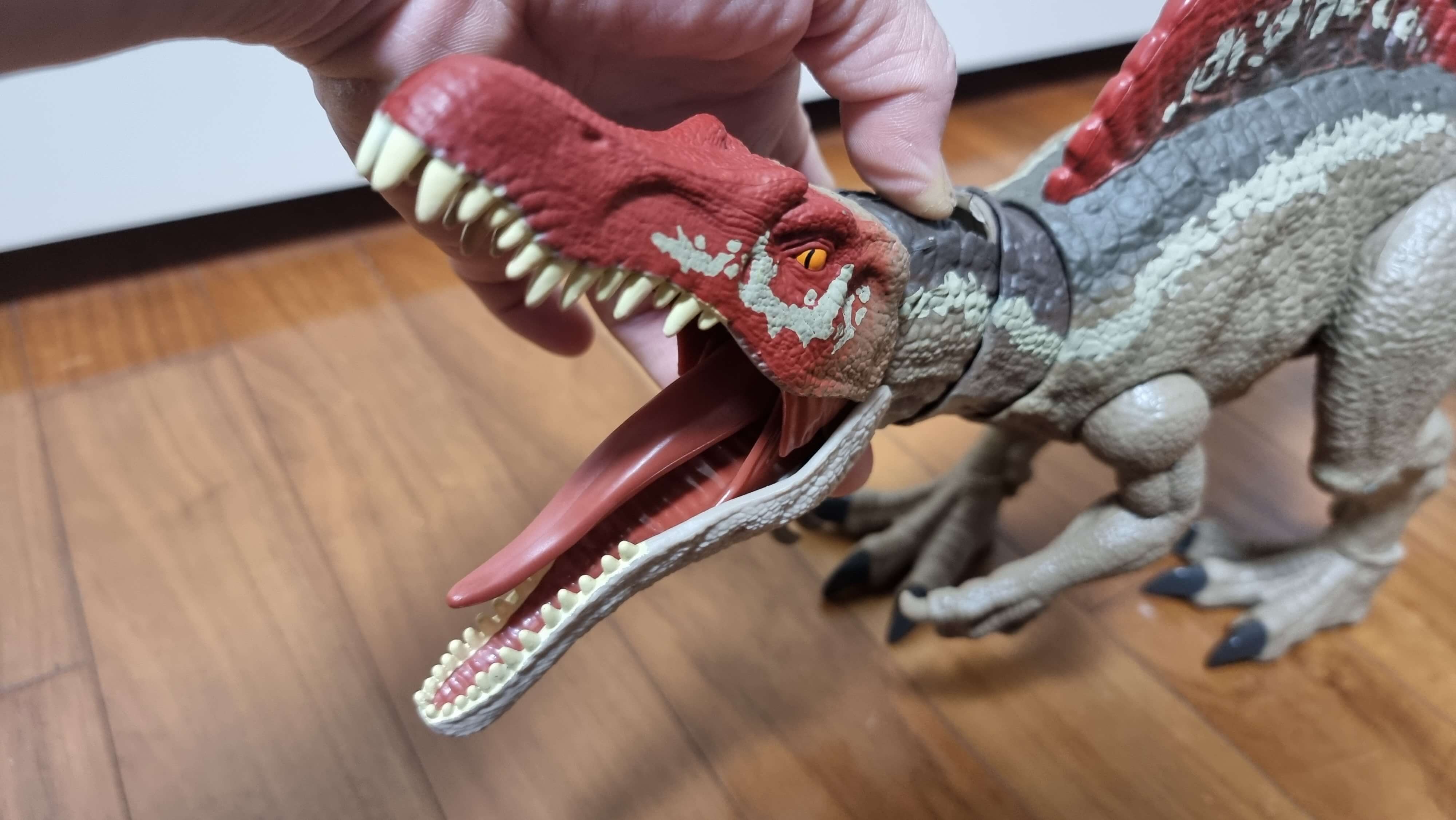 목 뒷부분을 누르면 공룡이 입을 크~게 벌리는데 정말 무섭게 생긴 공룡이라는 건 설명 안해도 확실히 알 수가 있겠네요. 공룡의 머리 부분, 팔, 다리, 꼬리 부분의 골절이 움직이니 원하는 자세로 설정하는 것도 가능합니다.